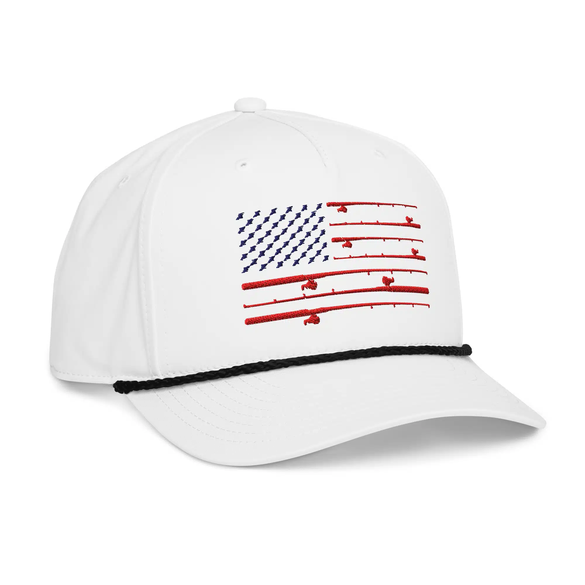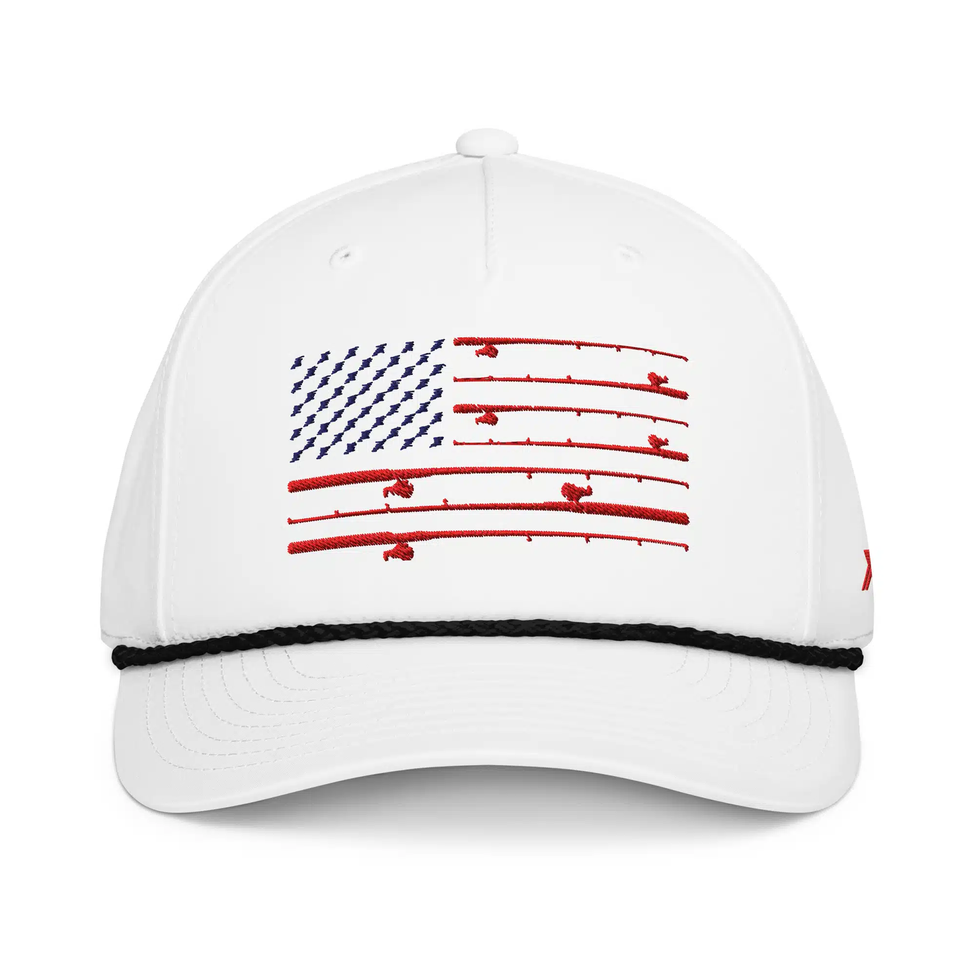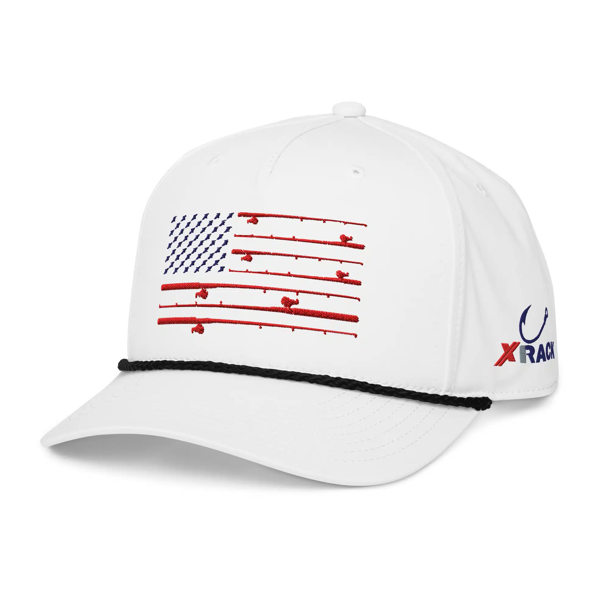White Hat with black rope. X-Rack rod flag on front, X-Rack logo and fish hook on side.